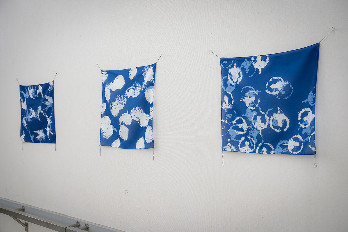 まずは自由なデザインを考案し、図柄をカッターで切り抜いて型紙を制作。まきろうと染色をあわせて3回を行っていきます。2回目、3回目と型紙をずらして配置することで、藍色の濃淡のコントラストがくっきりと表れ、デザインがより美しく映える作品に仕上がりました。