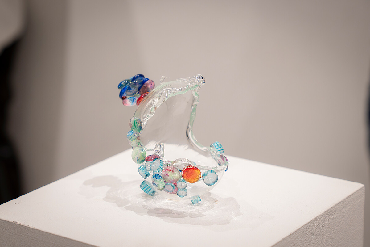 高校ではプロダクトデザインを学びましたが、誰かのためではなく、自分が心から作りたいものを形にしたいと工芸学科へ進みました。中でも、うねる熱いガラスを手で成形する吹きガラスの魅力に惹かれて、以来、制作の中心としています。卒業制作はキルンワークも取り入れますが、今後も吹きガラスに力を入れて自分の思い描く形を追求していくつもりです。