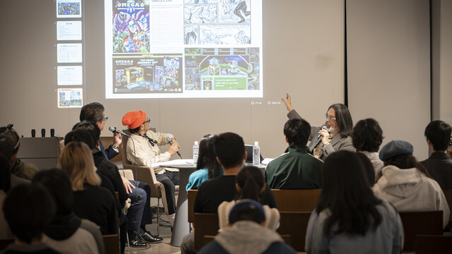 芸術情報センターのエントランスを抜けると、まず目につく精悍な狼の像は工芸学科で学長賞に選ばれた金属工芸コースの山田慈門さんの作品。パイプオルガンのあるアートホールには建築学科や映像学科などの作品が展示されました。展示ホールでは、美術学科の学長賞に輝いた油画コースの若林いぶきさんの「伽藍堂の哲学」をはじめ、美術学科やデザイン学科、写真学科、アートサイエンス学科などの優秀作品が並び、受賞者が来場者にむけて制作意図を説明している姿が見られました。初日は同時開催の「卒業制作展DEキャンパスを見てみよう!」と重なったこともあって、高校生や家族連れなど多くの人々で賑わいました。