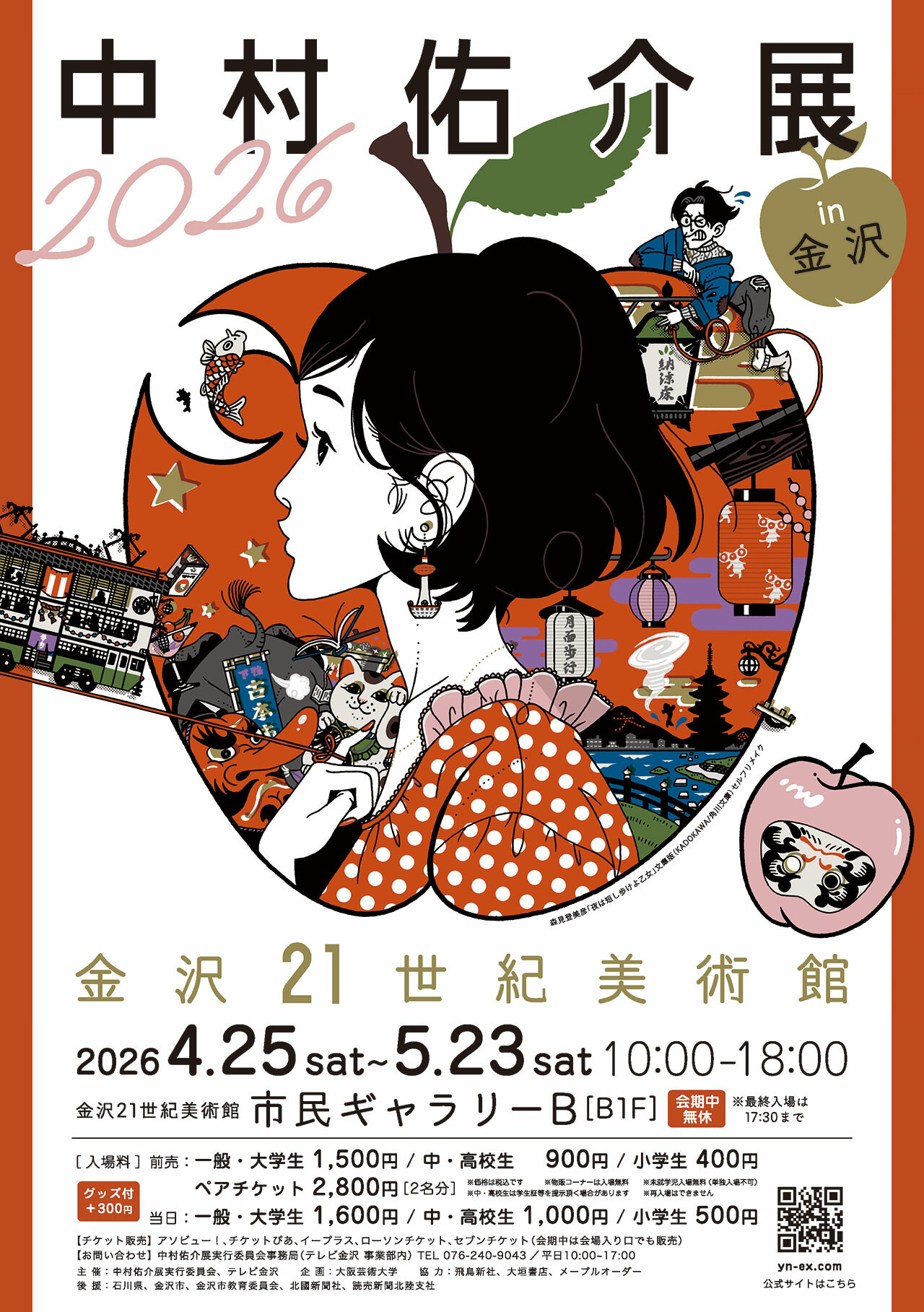 本展覧会では、そんな中村佑介がこれまでに携わってきた仕事のほぼすべてをテーマ毎に展示します。それぞれのテーマのもと、完成イラストはもちろん、着色前の線画やアイデアスケッチなども公開。さらに会期中には、サイン会や、オリジナルグッズ、イベントを予定しています。5年ぶりに金沢21世紀美術館で開催される本展は、5年間に100点以上の作品が増え大幅にボリュームアップしています。(前回比150%)