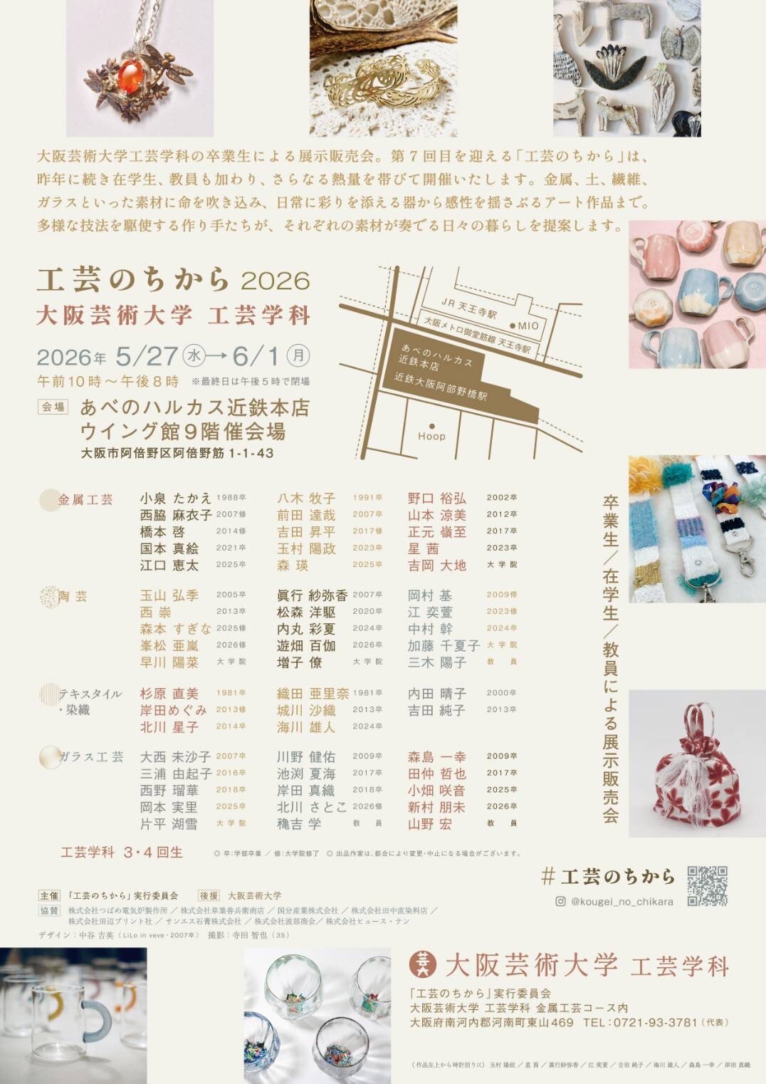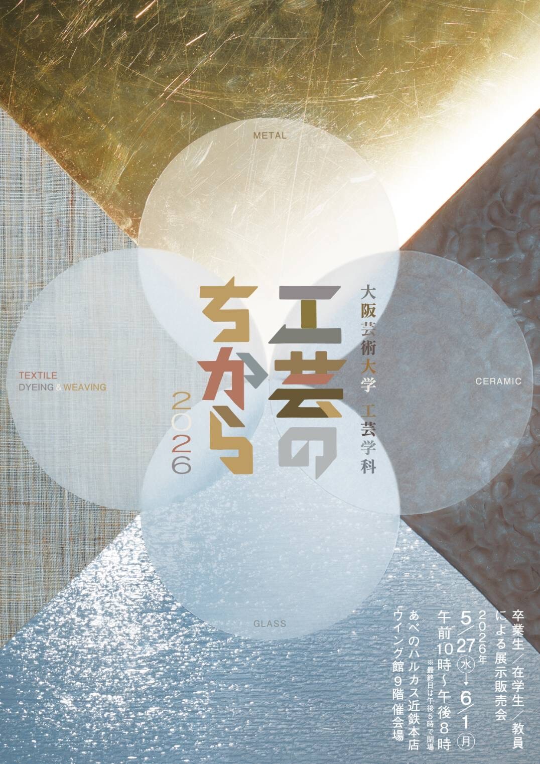 大阪芸術大学工芸学科の卒業生による展示販売会。第7回目を迎える「工芸のちから」は、昨年に続き在学生、教員も加わり、さらなる熱量を帯びて開催いたします。金属、土、繊維、ガラスといった素材に命を吹き込み、日常に寄り添える器から歓声を揺さぶるアート作品まで。多様な技法を駆使する作り手たちが、それぞれの素材で奏でる日々の暮らしを提案します。